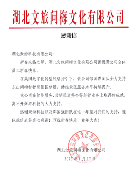 新春到來(lái)之際,聚游科技收到來(lái)自湖北文旅問(wèn)梅文化有限公司(黃梅公司)的感謝信。信中寫(xiě)道:在集團(tuán)數(shù)字化轉(zhuǎn)型戰(zhàn)略指引下,聚游科技智慧景區(qū)建設(shè)團(tuán)隊(duì)全力支持東山問(wèn)梅村智慧景區(qū)建設(shè),有力地助推了景區(qū)服務(wù)質(zhì)量提升,助力公司在智能服務(wù)、營(yíng)銷(xiāo)渠道整合等等經(jīng)營(yíng)業(yè)務(wù)上取得成就。