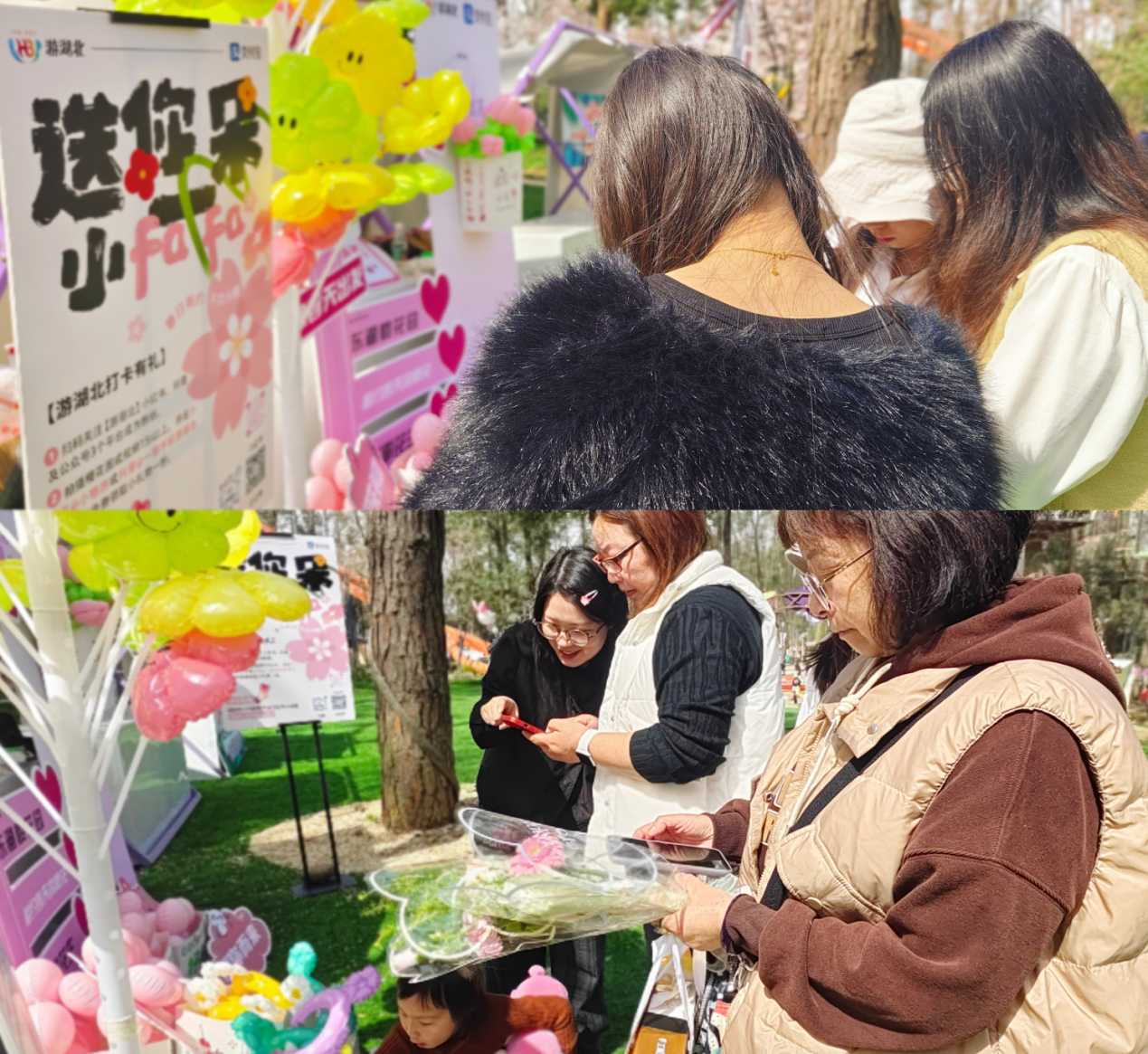 活動(dòng)現(xiàn)場(chǎng),游客們只需掃碼關(guān)注“游湖北”新媒體矩陣賬號(hào),并分享賞櫻圖片或視頻至社交平臺(tái),即可獲得旺旺布丁/氣球花/氣球花包/花花發(fā)箍等精美禮品。豐富多樣的禮品引來(lái)眾多賞花游客圍觀打卡,現(xiàn)場(chǎng)圈粉無(wú)數(shù)。