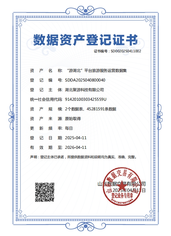 近日,湖北數(shù)字文旅集團旗下聚游科技公司在數(shù)據(jù)資產(chǎn)化領(lǐng)域傳來捷報。4月11日,其研發(fā)的"游湖北平臺旅游服務運營數(shù)據(jù)集"成功取得數(shù)據(jù)資產(chǎn)登記認證。