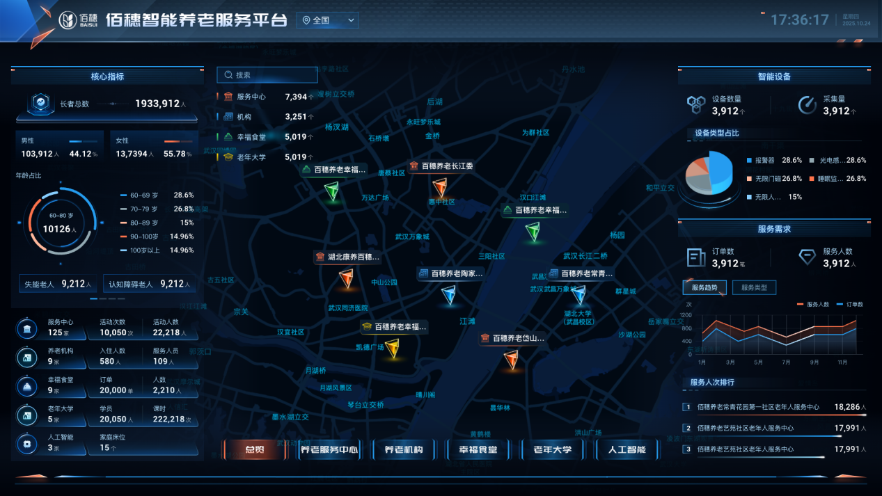 全面集成了長者、智能設備、服務需求等各類信息,不僅能展示長者總數(shù)、性別年齡分布、失能及認知障礙等特殊老人數(shù)量,還涵蓋服務中心、機構等養(yǎng)老設施相關數(shù)據(jù)。通過地圖標記、餅圖、折線圖等可視化方式,將復雜數(shù)據(jù)直觀呈現(xiàn),同時精準統(tǒng)計設備數(shù)量、采集量、訂單數(shù)等,支持按時間篩選。