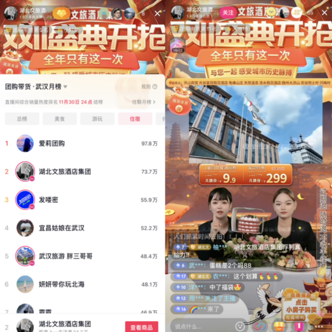 首戰(zhàn)告捷!數(shù)旅集團聯(lián)手酒店集團“雙十一”直播,躋身武漢團購帶貨榜單月榜第2名