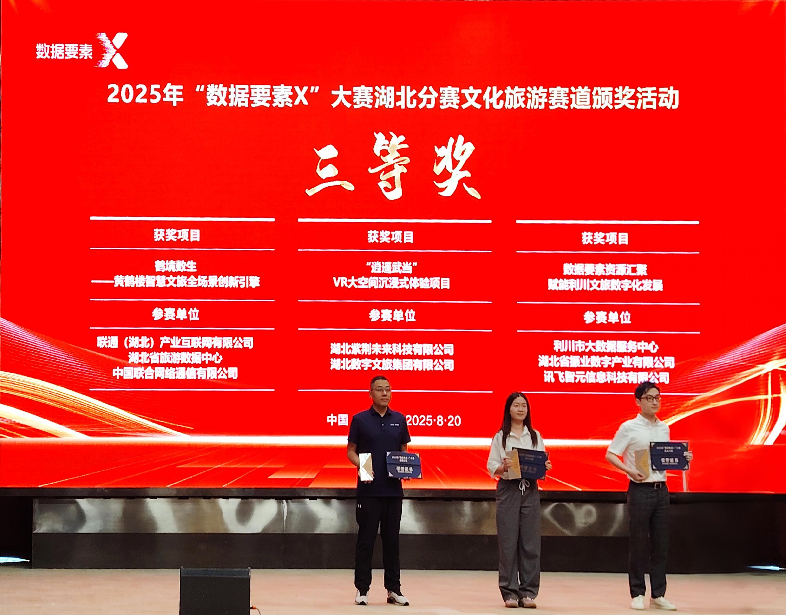 8月20日,由湖北省數據局、湖北省文化和旅游廳、十堰市人民政府主辦的2025年“數據要素×”大賽湖北分賽文化旅游賽道決賽活動在十堰成功舉行。數旅集團參賽項目均獲得獎項,湖北文旅全域智慧旅游綜合服務平臺獲二等獎(賽道第2名)、“逍遙武當”VR大空間沉浸式體驗項目獲三等獎(賽道第4名)、無人機航拍服務平臺和智景游景區(qū)綜合運營管理平臺獲優(yōu)秀獎。在參賽數量、入圍率及獎項層級上均實現顯著突破,充分彰顯了公司在數據要素領域的技術積累與創(chuàng)新實力。