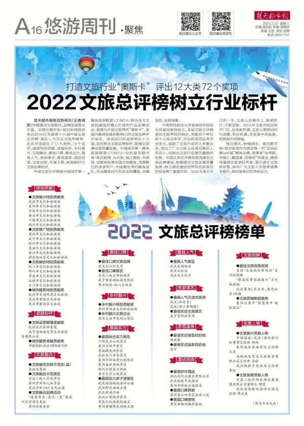 本周熱點 文旅界的“奧斯卡”!古隆中景區(qū)榮獲2022年度中國文旅總評榜“最具綜合實力景區(qū)”等獎項。2月22日,第十六屆中國文旅總評榜正式發(fā)布榜單,古隆中景區(qū)榮獲中國文旅總評榜“2022年度最具綜合實力景區(qū)”、“2022年度文旅營銷新銳案例”。中國文旅總評榜是在中國文旅品牌(博鰲)論壇背景下,由中國城市第一媒體文旅聯(lián)盟(CUMTA)聯(lián)合各方文旅權(quán)威組織精心打造的行業(yè)品牌活動,被譽為中國文旅界的“奧斯卡”獎,是國內(nèi)最具權(quán)威和影響力的文旅品牌評價體系?;顒幼?022年11月啟動以來,共收到數(shù)百個單位和個人的報名資料,經(jīng)評審委員會專家審定,最終誕生了12大類別、72個獎項,涵蓋文旅局、景區(qū)、旅游目的地、旅行社、酒店民宿、鄉(xiāng)村振興、演藝夜游、文旅推廣、年度人物等。襄陽古隆中景區(qū)開創(chuàng)了新的文旅融合發(fā)展格局,利用新媒體矩陣,持續(xù)舉辦了多場新媒體活動,在全國范圍展示了深厚的三國文化底蘊,展示了湖北文旅新形象。 清江畫廊公司榮獲2022年度中國景區(qū)影響力品牌“年度創(chuàng)新山水型景區(qū)”稱號。 近日,2022年中國文旅產(chǎn)業(yè)投資運營大會在湖北武漢召開,大會上公布了2022年度中國景區(qū)影響力品牌榜單,清江畫廊景區(qū)榮獲“年度創(chuàng)新山水型景區(qū)”稱號。2022年度中國景區(qū)影響力品牌排名是通過監(jiān)測景區(qū)在互聯(lián)網(wǎng)和移動互聯(lián)網(wǎng)的搜索、運營、媒體、點評指數(shù),綜合分析計算得出MBI/MCI指數(shù)排名,來反映一段時間內(nèi)景區(qū)在全國的品牌影響力,通過海量真實數(shù)據(jù)制作榜單。清江畫廊景區(qū)的入選,也代表著文旅行業(yè)正在不遺余力的推進文化和旅游產(chǎn)業(yè)鏈合作進程,推進企業(yè)跨越式發(fā)展,努力為市場提交一份滿意的答卷。 海外(中旅)研學(xué)百人團首發(fā)啟動。以研學(xué)為途徑,博學(xué)而篤志;以自然為媒,躬行求知。2月15日,海外(中旅)集團研學(xué)中心帶領(lǐng)330余名學(xué)子們來到了農(nóng)耕年華研學(xué)基地,一場最美的研學(xué)際遇在等待著他們。2023新春首次啟動勞動教育研學(xué)之旅,共計330余名小學(xué)學(xué)子們,在海外(中旅)集團研學(xué)中心與學(xué)校的共同組織下,將一年級至六年級的學(xué)子們劃分為兩個團隊,一至三年級以國學(xué)與農(nóng)事為主,將中華國學(xué)與農(nóng)事生產(chǎn)文化代代相傳,既豐富了勞動體驗,又積累了國學(xué)底蘊。四至六年級以手工與農(nóng)耕為主,從小養(yǎng)成熱愛勞動,勤于實踐,珍惜糧食,懂得感恩的優(yōu)秀品德并受益終生。 最新資訊 ● 甘肅寧夏攜手打造“大西北”文旅IP。寧夏回族自治區(qū)文化和旅游廳與甘肅省文化和旅游廳在甘肅蘭州進行座談交流,共商大西北文旅抱團發(fā)展、做大做強大西北文旅品牌,合力促進文旅消費復(fù)蘇等事宜。根據(jù)會議消息,甘肅省文旅廳將全力支持寧夏文旅廳提出的關(guān)于“共商籌備第二屆大西北文旅高峰會、市場化發(fā)行西北旅游一卡通、成立西北生態(tài)康養(yǎng)旅游聯(lián)盟、做大做強大西北文旅品牌”等合作事宜和相關(guān)業(yè)務(wù)工作;寧夏文旅系統(tǒng)將著力加強戰(zhàn)略協(xié)作,精誠推進全面融合,共同打造好“大西北”這個獨特而共有的超級文旅大IP,深度推進與兄弟省區(qū)的合作,共同提振旅游經(jīng)濟,大力促進文旅復(fù)蘇發(fā)展,合力推動雙方文旅系統(tǒng)在更大范圍、更寬領(lǐng)域、更深層次開創(chuàng)務(wù)實合作新局面。 ● 成都高質(zhì)量打造文旅經(jīng)濟發(fā)展核心區(qū)推動世界文化名城建設(shè)。2月22日,成都市文化廣電旅游局發(fā)布《高質(zhì)量打造全省文旅經(jīng)濟發(fā)展核心區(qū)推動世界文化名城建設(shè)行動方案》。到2025年,力爭實現(xiàn)成都市文創(chuàng)產(chǎn)業(yè)增加值3100億—3400億元,占GDP比重達到12%以上,旅游接待游客達到3.5億人次,總收入達到6300億元,文化產(chǎn)業(yè)增加值占全省比重達到53%,旅游總收入占全省比重增長到39%。實施文創(chuàng)、旅游企業(yè)梯度培育計劃,支持本土龍頭企業(yè)上市及沖刺全國文化企業(yè)30強、中國旅游集團20強,實現(xiàn)省級文化和旅游產(chǎn)業(yè)優(yōu)秀龍頭企業(yè)達到15家以上。 ● 長沙打造文旅業(yè)“復(fù)原力” 發(fā)放400萬元消費券。長沙市文化旅游廣電局制定出臺了《關(guān)于促進文旅產(chǎn)業(yè)穩(wěn)定發(fā)展的若干措施》,旨在打造文旅業(yè)“復(fù)原力”,全面促進文化和旅游市場高質(zhì)量發(fā)展。將舉辦“長沙有喜 福滿星城”消費季,發(fā)行全國唯一由政府搭臺、市場運作、文旅商融合的生活服務(wù)類折扣卡——“長沙城市嗨卡”。通過攜程平臺發(fā)放400萬元文旅消費券。聯(lián)動全市四個國家級夜間文旅消費集聚區(qū)開展系列促消費活動。支持各市場主體發(fā)展消費新業(yè)態(tài)、打造消費新場景。結(jié)合四季主題消費活動,發(fā)布旅游精品線路。舉辦第二屆全市旅游發(fā)展大會。 ● 桂林部署打造世界級旅游品牌。近日,桂林市第六屆人民代表大會第四次會議召開。根據(jù)會議報告內(nèi)容,桂林將持續(xù)推進“一城一都