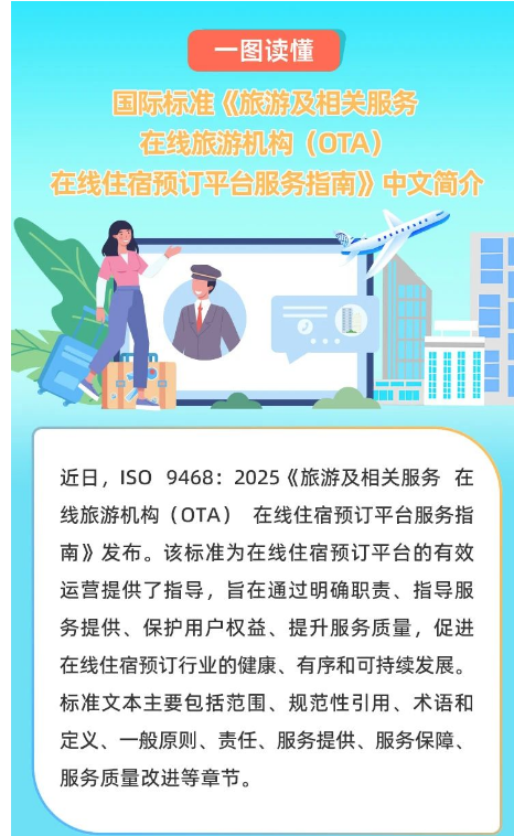 我國牽頭制定全球首個在線旅游機構(gòu)相關(guān)國際標準,以“中國方案”推動全球旅游服務(wù)標準化進程。近日,我國牽頭制定的《旅游及相關(guān)服務(wù)在線旅游機構(gòu)(OTA)在線住宿預訂平臺服務(wù)指南》(ISO9468:2025)國際標準正式發(fā)布。這是全球首個在線旅游機構(gòu)相關(guān)國際標準,旨在規(guī)范全球在線住宿預訂平臺及其服務(wù),破解“大數(shù)據(jù)殺熟”“捆綁消費”“退改難”等痛點,構(gòu)建公平透明的消費生態(tài)?!吨改稀访鞔_了平臺方和住宿服務(wù)提供商的責任,規(guī)范了訂購、支付、退改、評價等環(huán)節(jié)的服務(wù)條款,提出了信息安全、財務(wù)安全和隱私保護等方面的服務(wù)保障要求。其發(fā)布是中國參與全球標準化工作的生動實踐,將推動全球旅游服務(wù)在標準化軌道上實現(xiàn)高質(zhì)量發(fā)展。